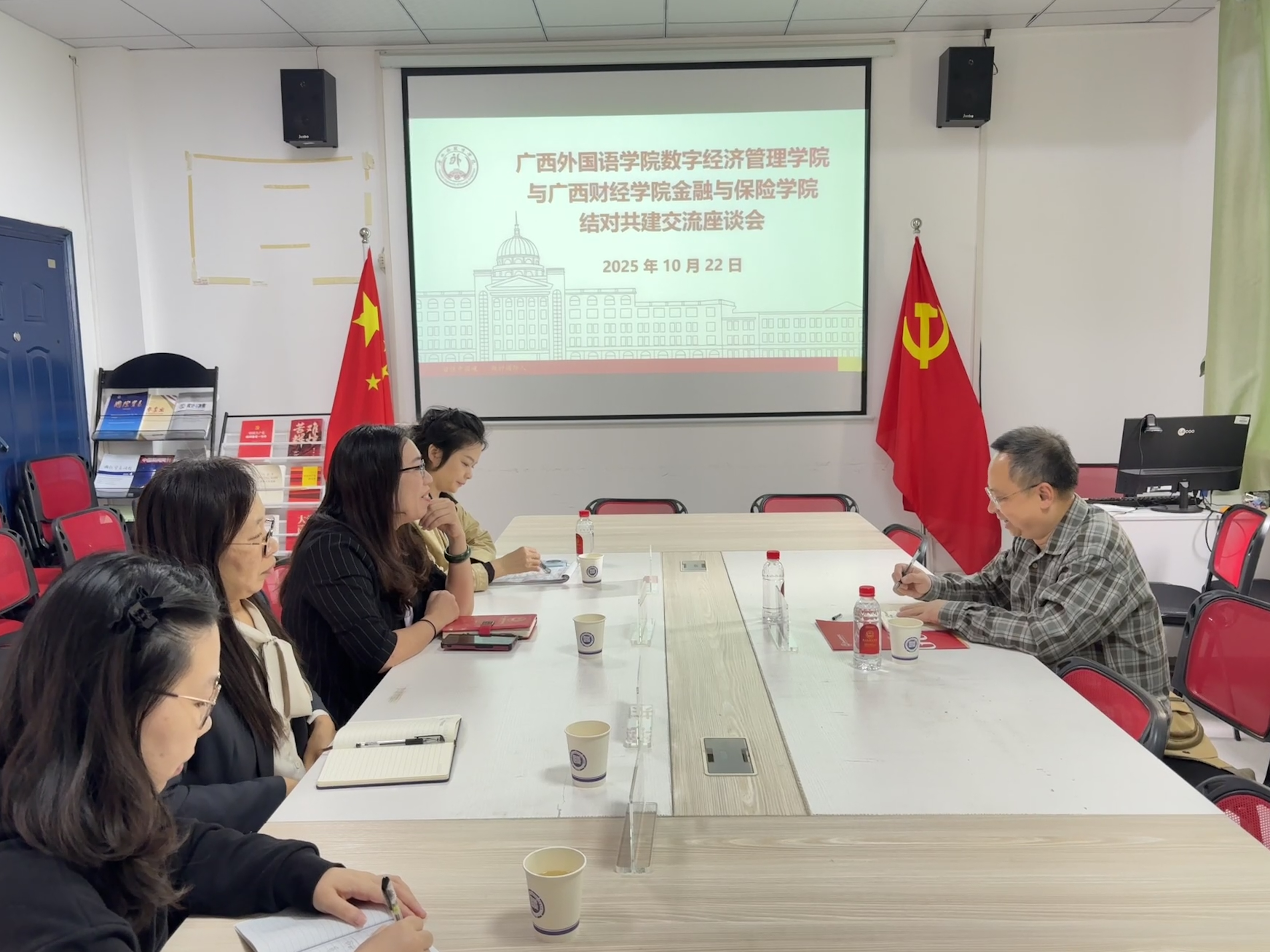 10月22日,广西财经学院金融与保险学院副院长黄荣哲教授与广西外国语学院数字经济管理学院开展校际交流座谈会。旨在深化两校在学科建设、人才培养、科研创新等领域的务实合作,响应国家“深化产教融合、校校协同”的高等教育发展号召。广西外国语学院教务处副处长石凤,数字经济管理学院院长陈倩、党总支书记郑秋、执行院长吕国清、副院长刘丹羽、金融系副主任庞李政参与座谈,双方围绕多维度合作展开深入探讨。