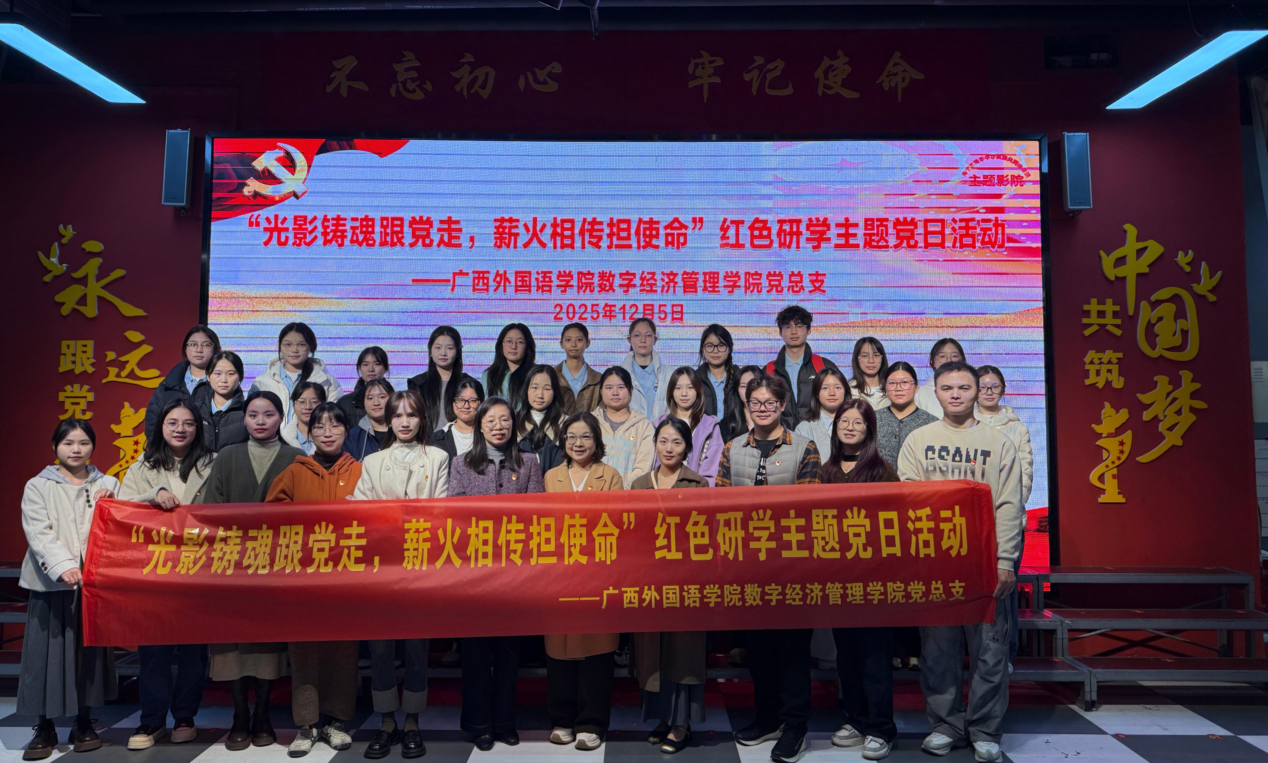 为深入学习贯彻党的创新理论,巩固拓展主题教育成果,推动红色基因与时代精神深度融合。12月5日,数字经济管理学院党总支组织师生党员及入党积极分子代表赴南宁市铸牢中华民族共同体意识主题影院,开展“光影铸魂跟党走,薪火相传担使命”红色研学主题党日活动,以沉浸式体验为载体筑牢信仰根基。