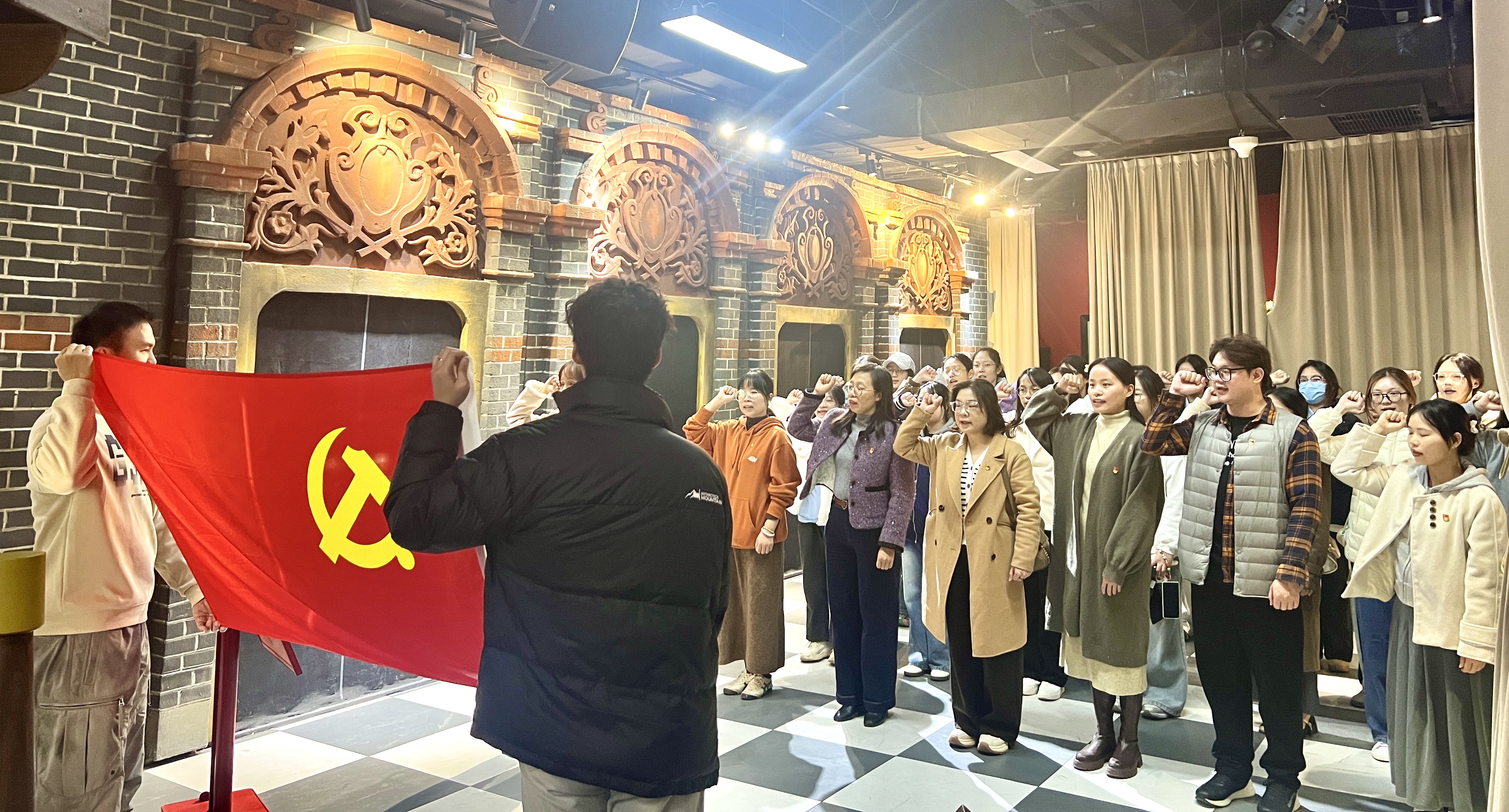 全体师生党员在庄严肃穆的“红船启航”实景体验区整齐列队,佩戴党员徽章,面向鲜红的党旗肃立。在党支部书记的带领下,大家高举右拳,重温入党誓词。铮铮誓言,字字铿锵,唤醒了每一位党员的初心使命,强化了责任担当。