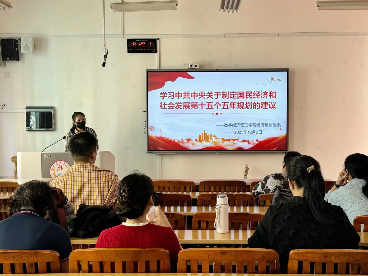 12月2日,数字经济管理学院经济与贸易系在大同楼D318召开了专题学习会议,深入学习《中共中央关于制定国民经济和社会发展第十五个五年规划的建议》(以下简称“十五五”规划建议),并围绕国际经济与贸易、跨境电子商务、市场营销、物流工程四个专业的建设方向展开讨论。系主任文园园主持会议,经贸系全体专业教师参加,活动采用全系集中学习,集中讨论的形式。会议旨在将国家战略需求转化为专业发展的具体路径,推动人才培养与产业升级同频共振。