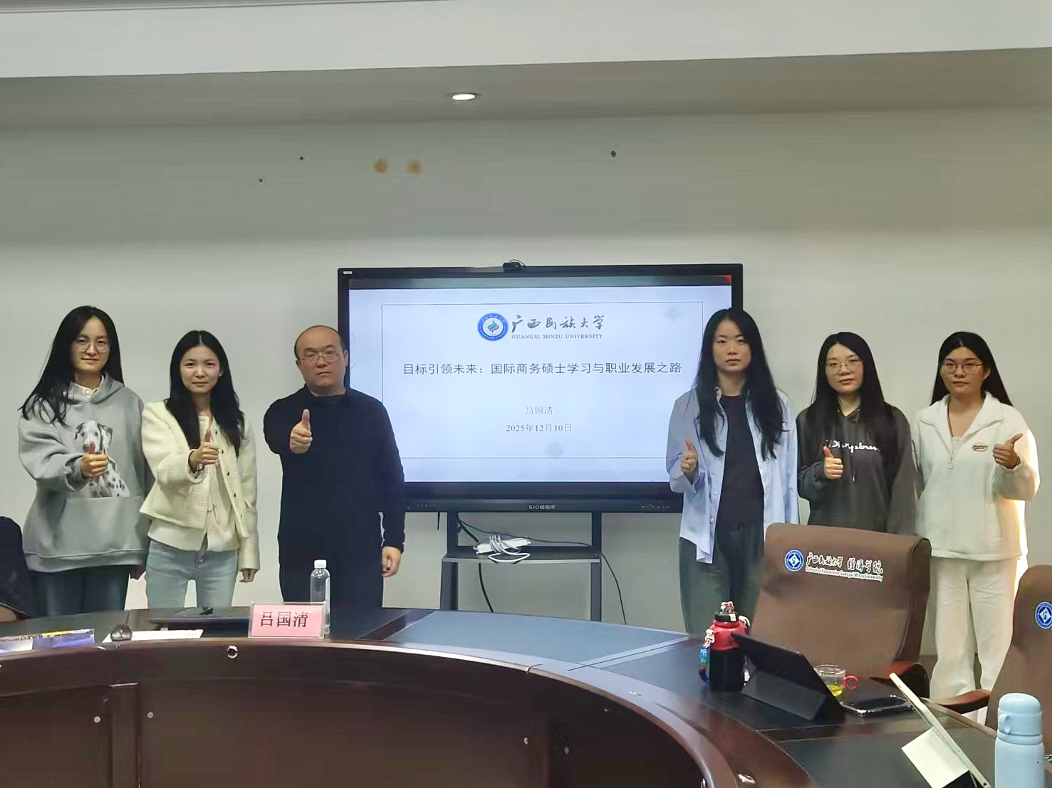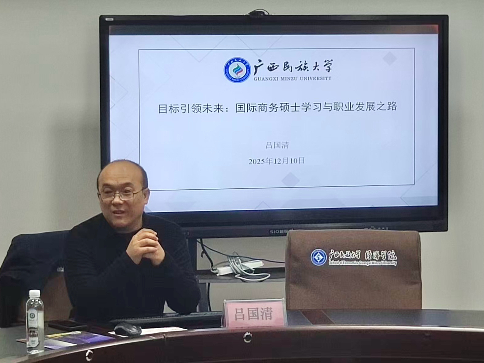 2025年12月10日下午,应广西民族大学经济学院邀请,我院执行院长、国际商务硕士校外导师吕国清教授赴该校,为该校2025级国际商务专业硕士研究生代表作了题为《目标引领未来:国际商务硕士学习与发展之路》的精彩讲座。此次交流活动展现了我院专家在相关领域的深厚积累与积极服务兄弟院校的责任担当。