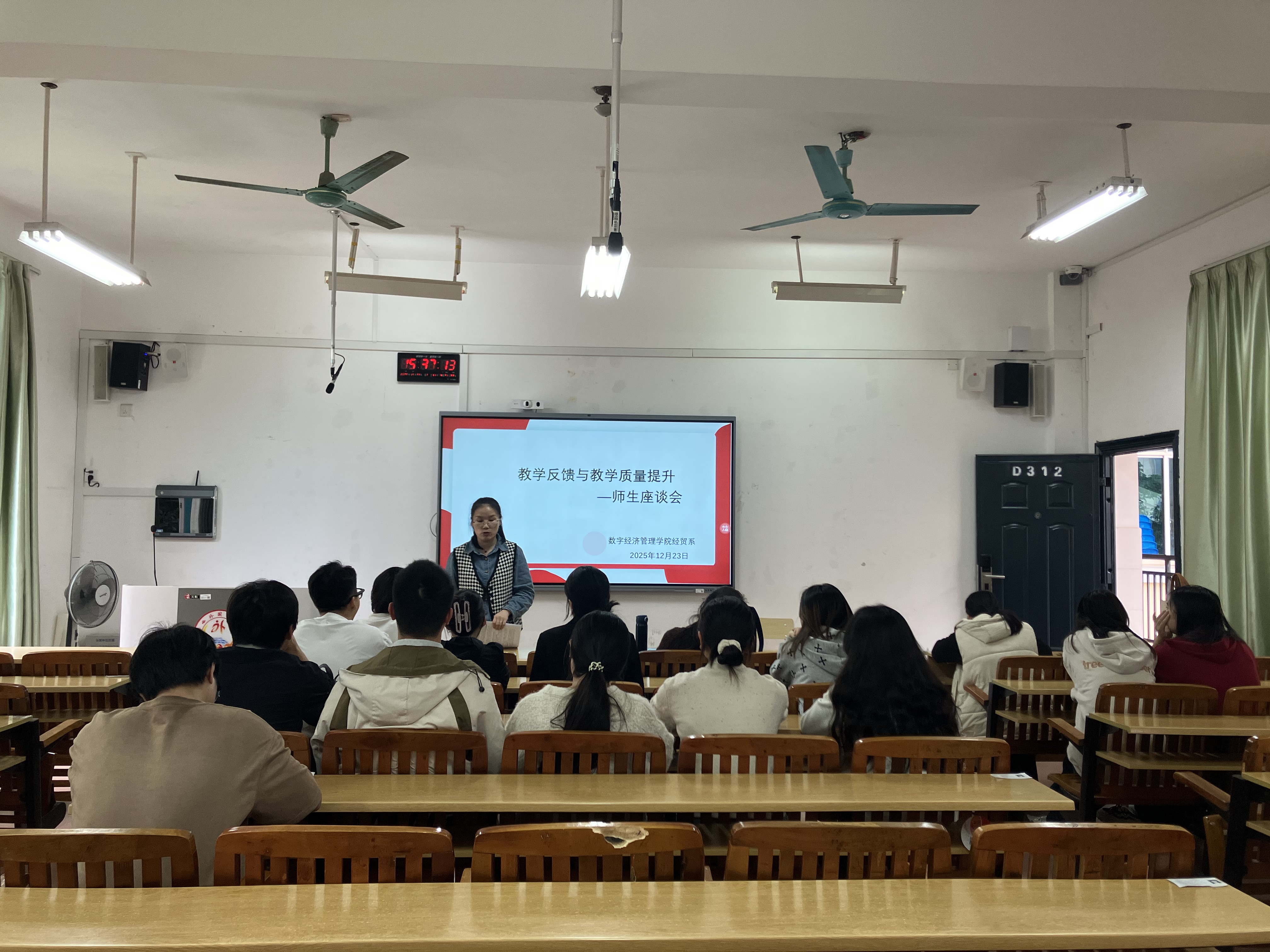 深入贯彻落实立德树人根本任务,进一步加强师生教学沟通,提升系部教学质量与人才培养水平, 2025年12月23日,数字经济管理学院经济与贸易系在D312召开“教学反馈与教学质量提升——师生座谈会”,旨在搭建师生深度沟通的桥梁,精准捕捉教学环节痛点,推动教学质量持续优化。本次会议由系主任、任课教师代表及来自国际经济与贸易专业、跨境电子商务专业、市场营销专业的班级学委参会,会议由经济与贸易系系主任文园园主持。