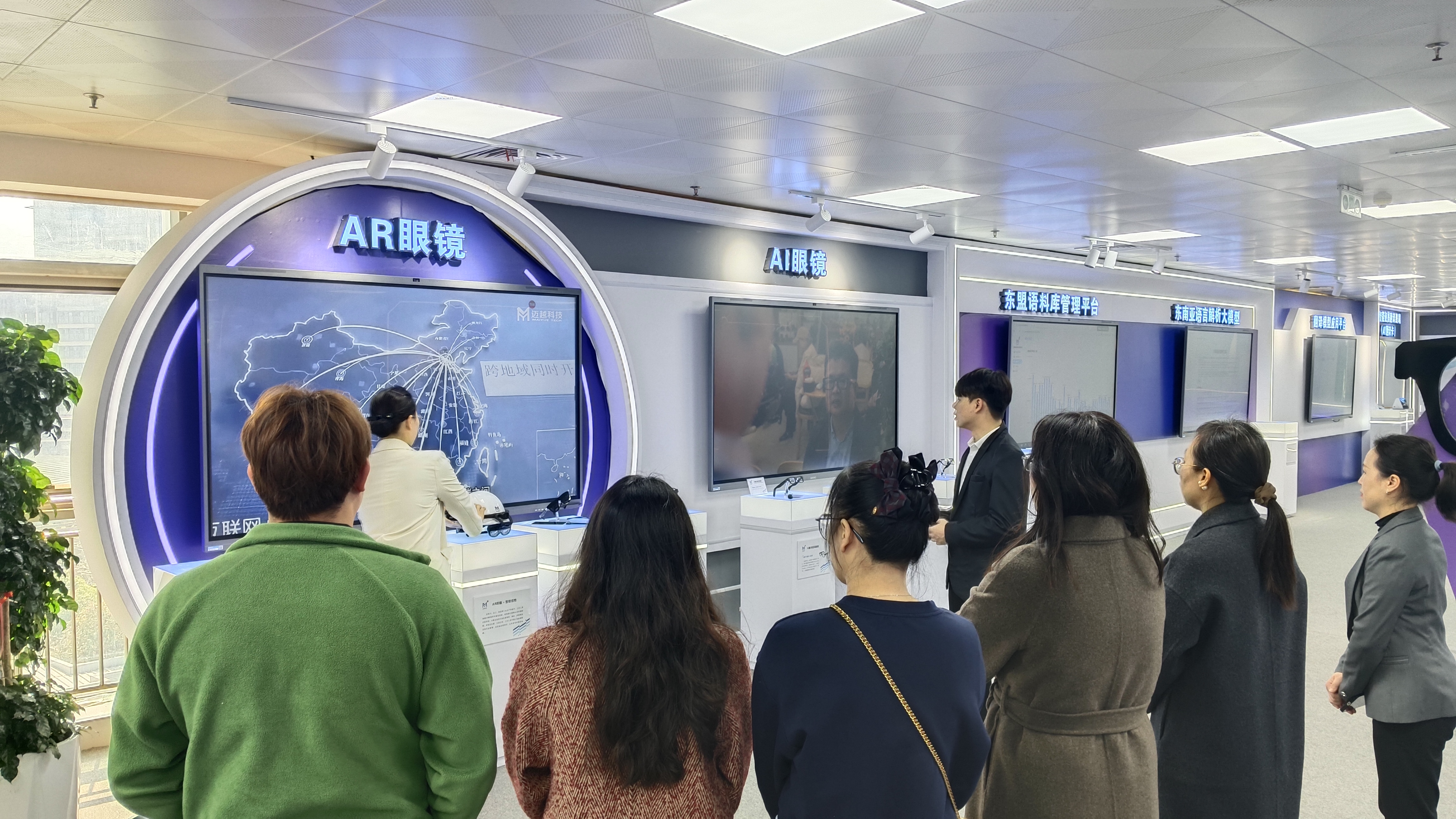 随后,在企业的陪同下,师生一行参观了迈越科技产品展示厅。大家近距离观摩了AR眼镜、AI翻译眼镜、东盟语料库管理平台等核心产品,直观感受了智能穿戴设备在实时翻译、跨地域协同办公等场景下的应用效果。学生代表们积极提问,与企业技术人员就产品研发、行业发展等话题展开交流,现场氛围热烈。