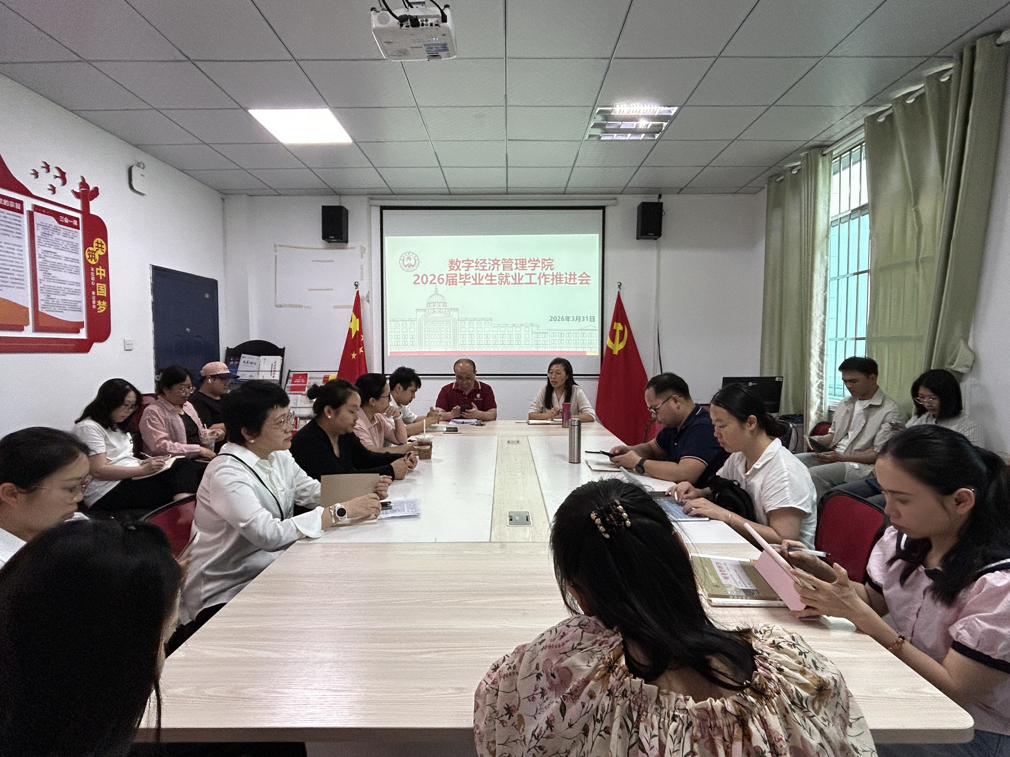 为切实做好2026届毕业生就业工作,直面当前就业工作严峻形势,凝聚全院就业工作合力,2026年3月31日,数字经济管理学院召开2026届毕业生就业工作推进会。学院院长吕国清、党总支书记郑秋、党总副书记李鹏飞,各系主任、专业负责人及各班辅导员参加本次会议,会议围绕就业工作攻坚、访企拓岗部署等核心内容作出全面安排。