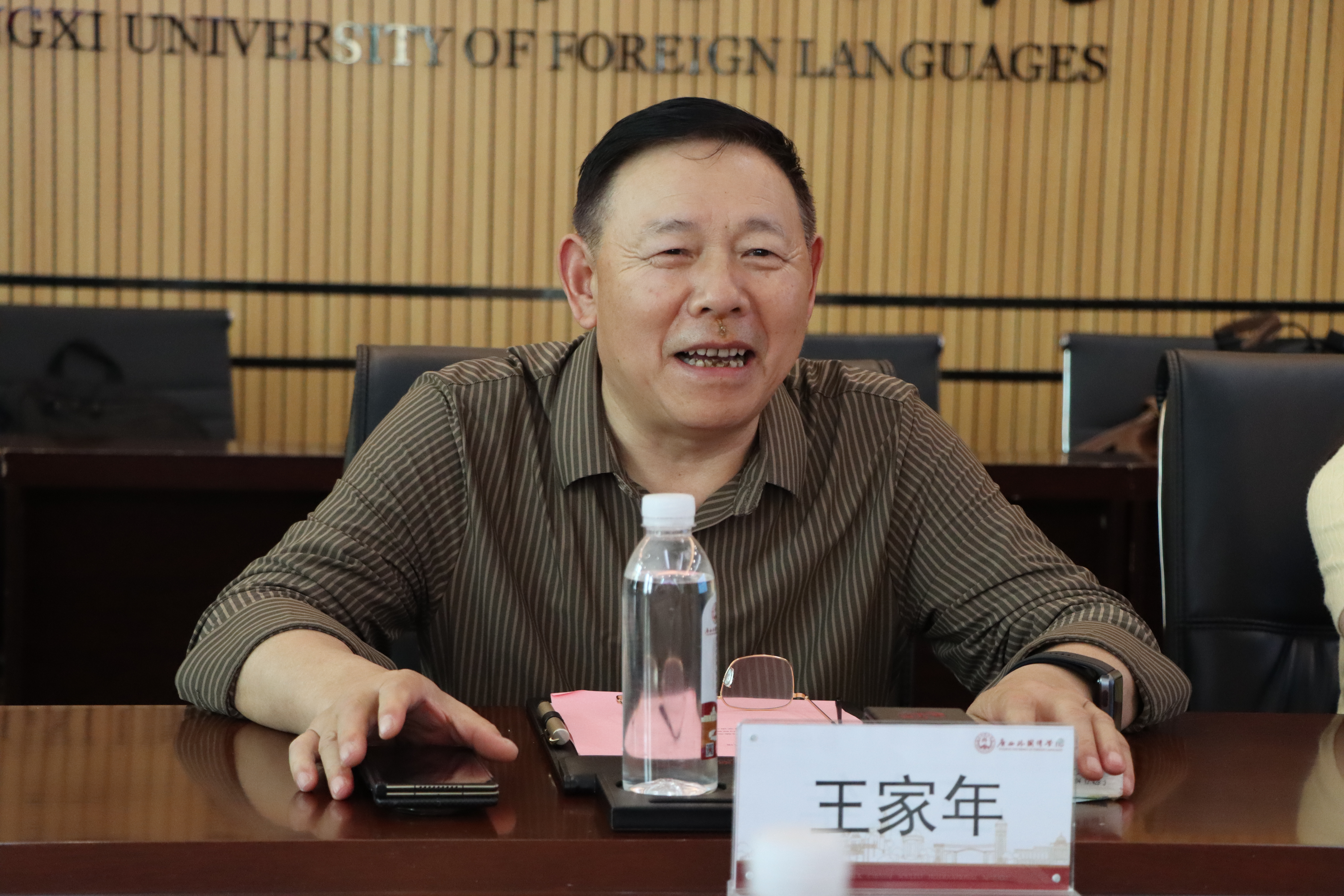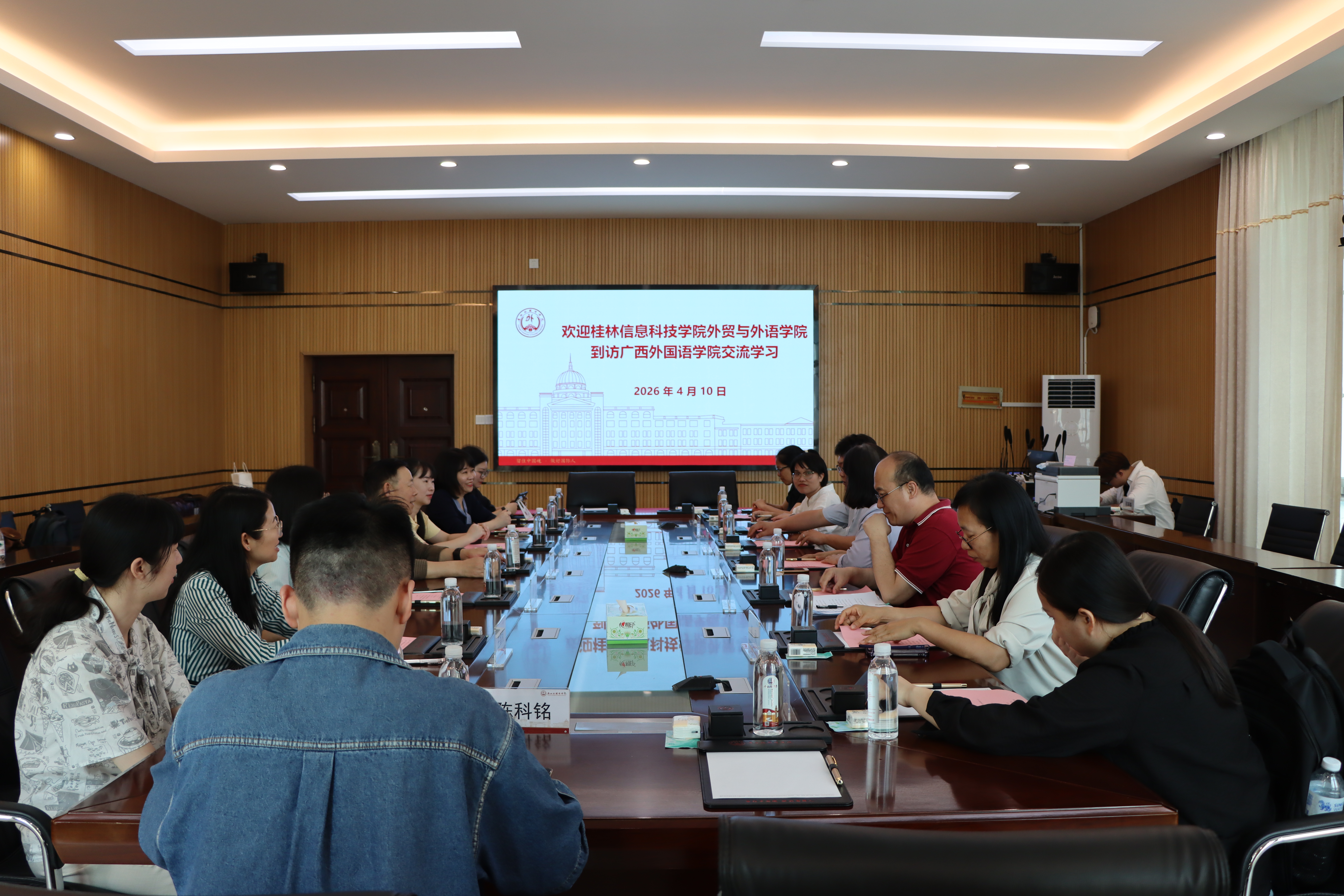 4月10日,桂林信息科技学院外贸与外语学院院长王家年一行8人到访广西外国语学院,开展考察交流。来访人员与我校数字经济管理学院和欧美语言文化学院教师代表围绕国际化办学、跨专业通识课程建设、应用型人才培养等议题进行了深入探讨。学校教学总督导宋亚菲陪同考察并主持座谈会。我校数字经济管理学院党委书记郑秋、欧美语言文化学院院长陈其乾,以及相关学院教师代表参加座谈交流。