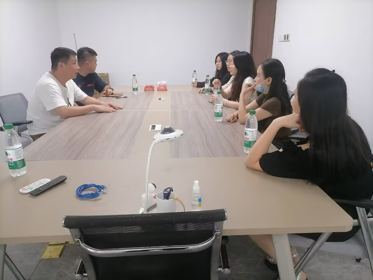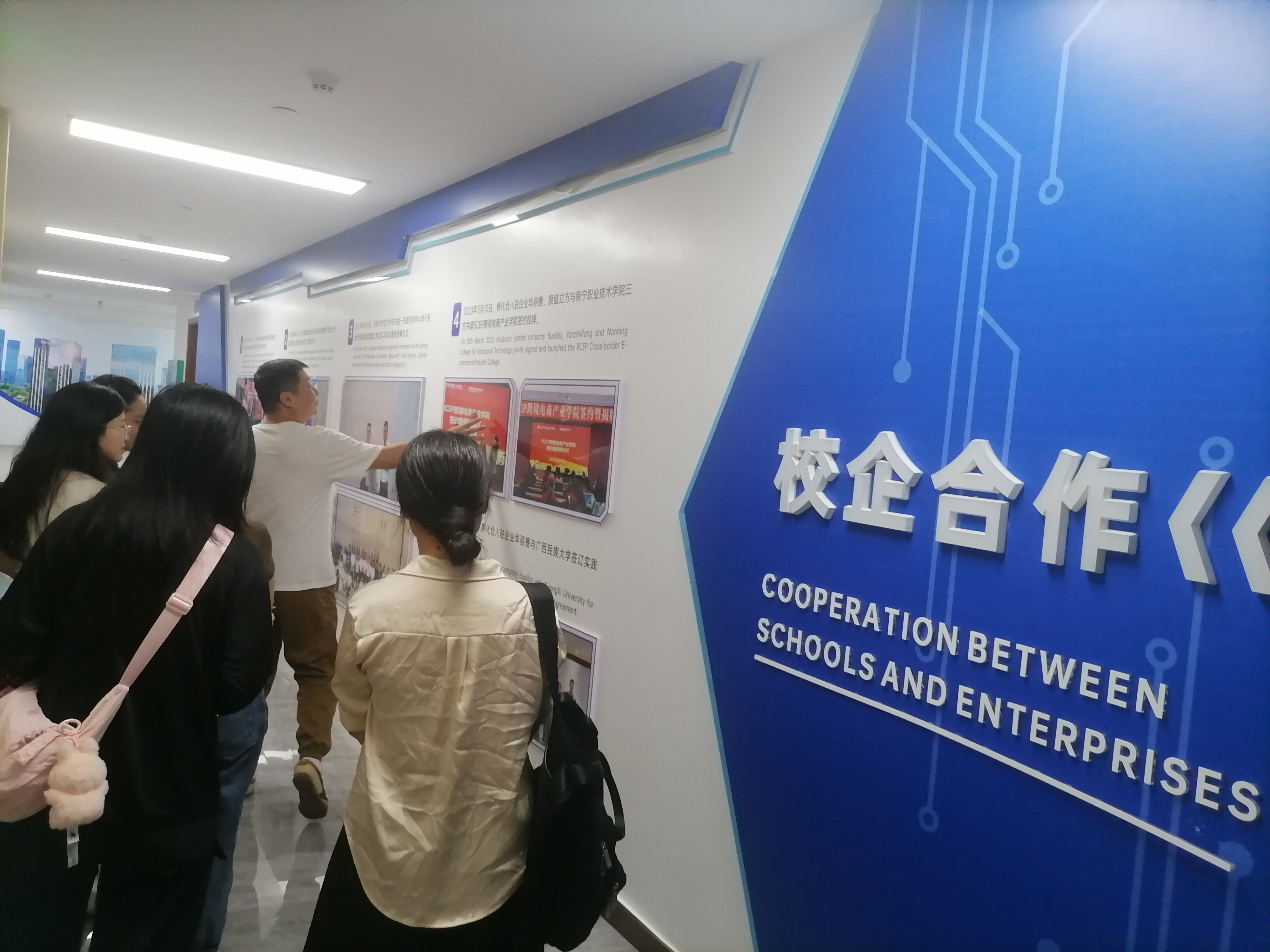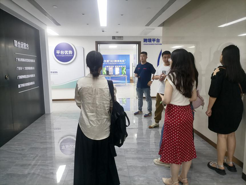在辫子文化传媒负责人陪同下,团队参观了直播电商基地、新媒体运营中心及“桂品出海”直播间。该公司为抖音华南前五、广西头部MCN机构,年流水超10亿元,培养主播3000余名,是广西商务厅东盟跨境电商合作单位。企业在TikTok跨境直播领域运营成熟,与学校“跨境电子商务实验教学中心”建设方向高度契合,该中心构建的“跨境电商运营+多语种直播+东盟市场分析”三位一体实践体系,与企业需求形成天然互补。