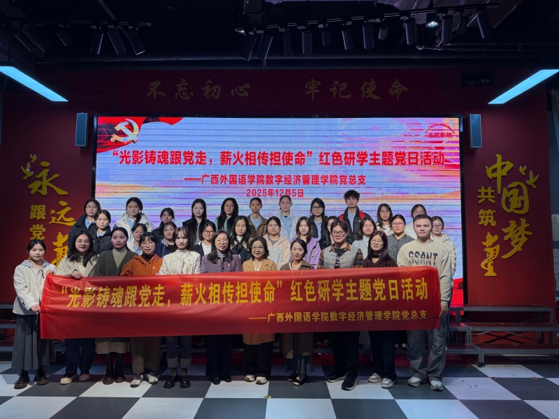 为深入学习贯彻党的创新理论,巩固拓展主题教育成果,推动红色基因与时代精神深度融合。数字经济管理学院党总支组织师生党员及入党积极分子代表赴南宁市铸牢中华民族共同体意识主题影院,开展 “光影铸魂跟党走,薪火相传担使命”红色研学主题党日活动,以沉浸式体验为载体筑牢信仰根基。